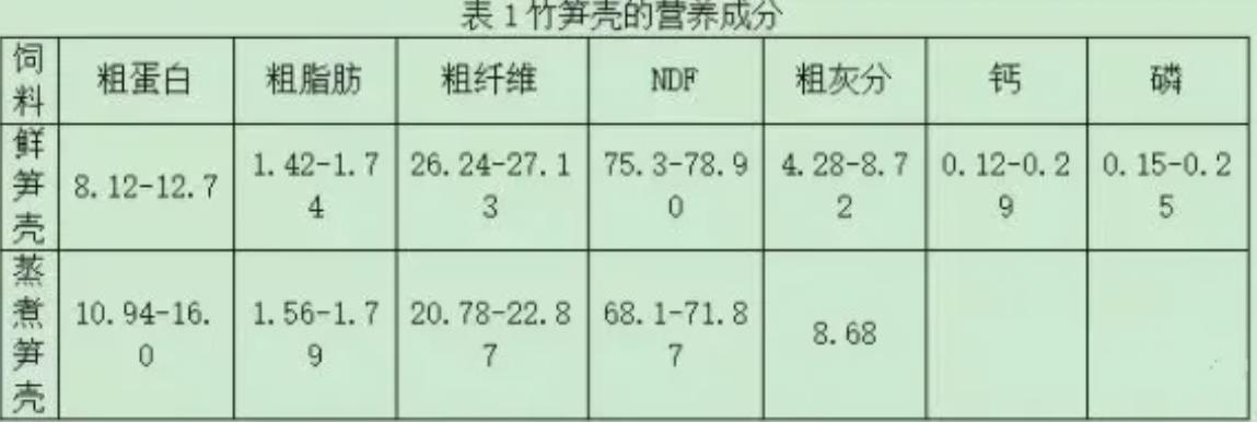 1、 常规营养成分竹笋壳含较高能量,肉牛代谢能含量为8.96 MJ/kg。鲜笋壳和熟煮笋壳的营养成分见表1[3-7]。鲜笋壳粗蛋白含量为8.12%~12.7%,高于玉米秸秆、小麦秸、稻秸等秸秆饲料,稍低于小麦麸的蛋白含量(13.3%~17.7%)。笋壳中含有木质化程度较高的笋蔸,故笋壳的木质素含量达到了4.69%。笋壳粗 脂肪(1.42%~1.74%)、NDF(75.3%~78.9% )、粗灰分(4.28%~8.68%)和钙磷含量与玉米秸秆等常见粗饲料相近。不同加工方式对笋壳的营养价值影响较大。由表1可见,蒸煮笋壳的粗蛋白、粗脂肪 含量明显高于鲜笋壳,蒸煮笋壳的蛋白含量最高可达16.0%,但纤维含量低于鲜笋壳。
